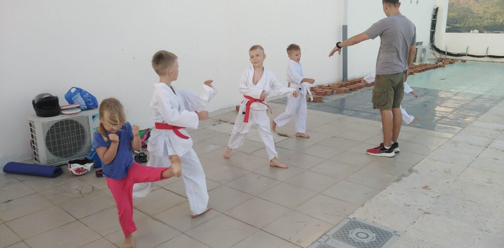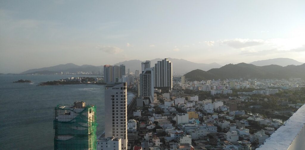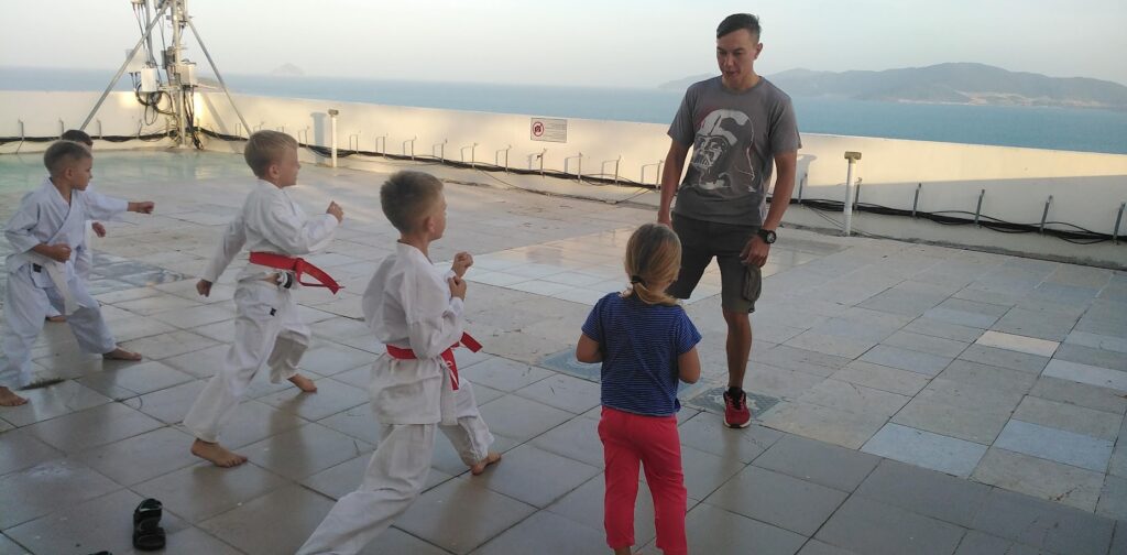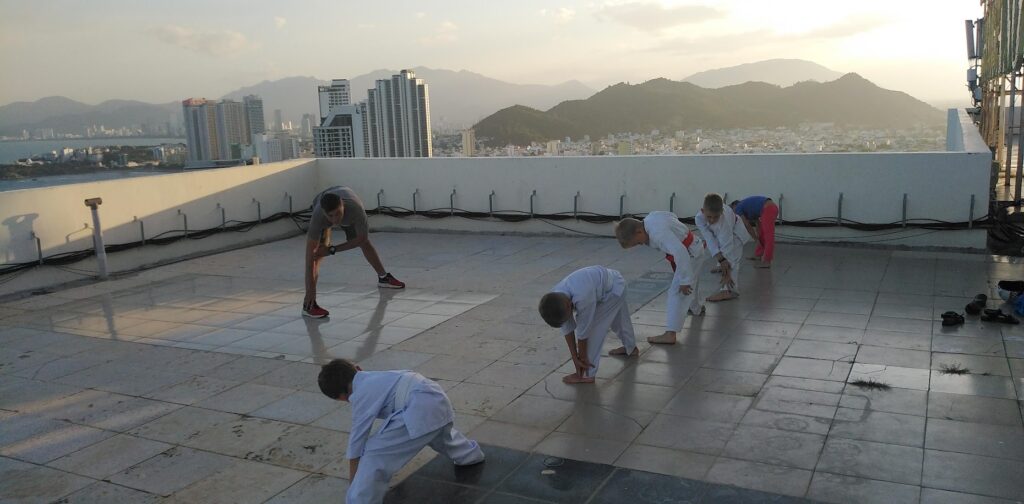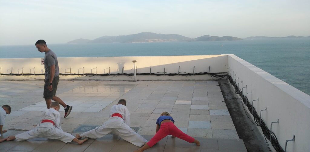В Нячанге — это довольно большой курортный город Вьетнама, и второй курорт Вьетнама по популярности среди россиян, после курортов острова Фукуок, я занималась карате в небольшой русскоязычной школе. И в хорошую погоду (а хорошая солнечная погода там была гораздо чаще, чем дождливая) мы тренировались на крыше одного из небоскрёбов города.